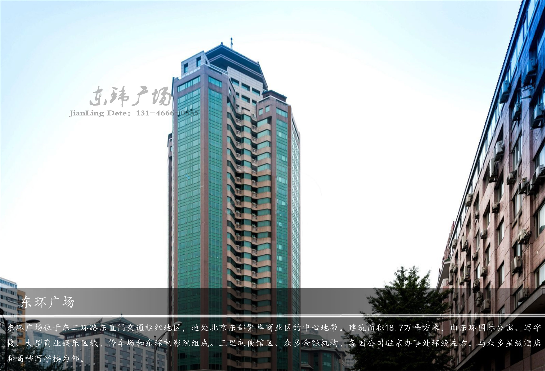 東環(huán)廣場(chǎng)位于東二環(huán)路東直門交通樞紐地區(qū),地處北京東部從建國(guó)門、國(guó)貿(mào)大廈到燕莎、國(guó)際展覽中心所構(gòu)成繁華商業(yè)區(qū)的中心地帶。建筑面積18.7萬(wàn)平方米,由東環(huán)國(guó)際公寓、寫字樓、大型商業(yè)娛樂(lè)區(qū)域、停車場(chǎng)和東環(huán)電影院組成。三里屯使館區(qū)、眾多金融機(jī)構(gòu)、各國(guó)公司駐京辦事處環(huán)繞左右,與眾多星級(jí)酒店和高檔寫字樓為鄰。