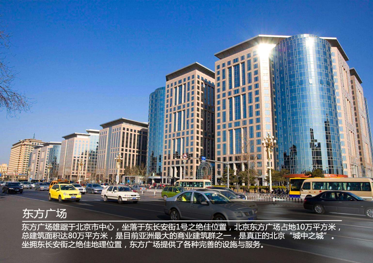 東方廣場雄踞于北京市中心,坐落于東長安街1號位置,東方廣場占地10萬平方米,總建筑面積達80萬平方米,是目前亞洲商業(yè)建筑群之一,是真正的北京“城中之城”。他的英國名字又叫做Oriental Plaza.它坐擁東長安街之地理位置,東方廣場提供了各種完善的設施與服務,其東方經貿城擁有8幢甲級寫字樓,擁有不同主題的購物區(qū)、四季常青的花壇、市中心五彩音樂噴泉以及擁有逾1,800個停車位的室內停車場。云集了眾多財富500強企業(yè)與各行業(yè)龍頭公司在此;東方豪庭公寓擁有2幢豪華服務式公寓,為優(yōu)雅、時尚與便利生活提供了保證。