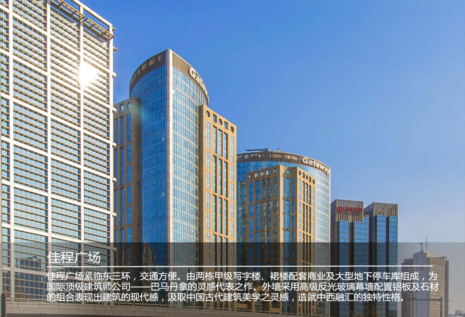 佳程廣場(chǎng)緊臨東三環(huán),交通方便。由兩棟甲級(jí)寫字樓、裙樓配套商業(yè)及大型地下停車庫組成,為國(guó)際建筑師公司——巴馬丹拿(P&TGROUP)的靈感代表之作。外墻采用高級(jí)反光玻璃幕墻配置鋁板及石材的組合表現(xiàn)出建筑的現(xiàn)代感,汲取中國(guó)古代建筑美學(xué)之靈感,造就中西融匯的獨(dú)特性格。